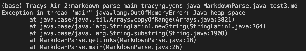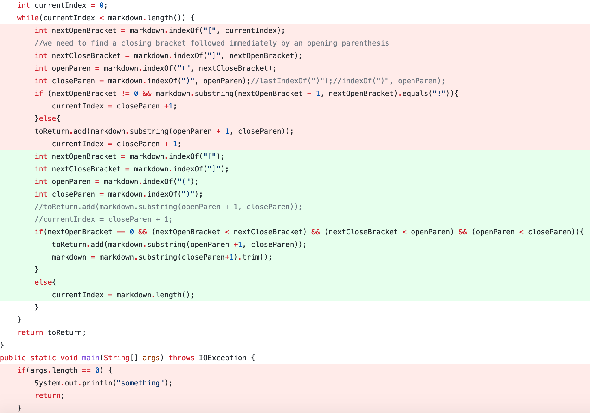 The test file caused an out of memory error which was a symptom that pointed out to me that there was a bug in the intial code. However, rerunning it with the added code that defined the positioning of where the open/close brackets and the open/close parentheses should be, it printed out the correct output “[linkrus.com]” because it stopped right after the first parenthesis aka closParen.