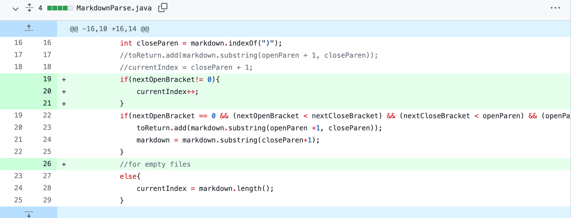 The test file caused an out of memory error which was a symptom that pointed out to me that there was a bug in the intial code. As. I reran with my new code, I did get the output I was expected, “[something.com]” however, I was unsure if it still read through all the characters in the file but only returned or link or if it just completely stopped after the closeParen. In this case, although the symptom of the bug is not clearly showinig, the bug could still be there.